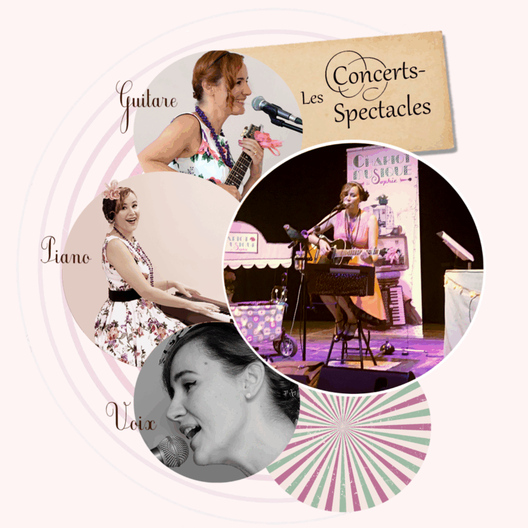 Le concert-spectacle, installation fixe avec décor, guitare, piano et chant, est idéale pour s’adresser à un grand nombre de personnes tout en leur garantissant une écoute de qualité grâce à une sonorisation efficace et discrète.